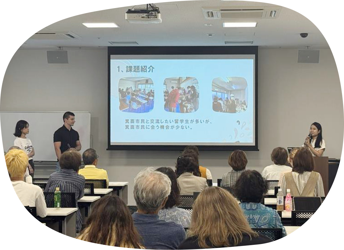 - 留学生がプロジェクト活動を通して、箕面の自然・歴史・文化・社会などを広く知るとともに、箕面についての課題を見つけてその解決方法を考え、地域に向けて発表・発信します。