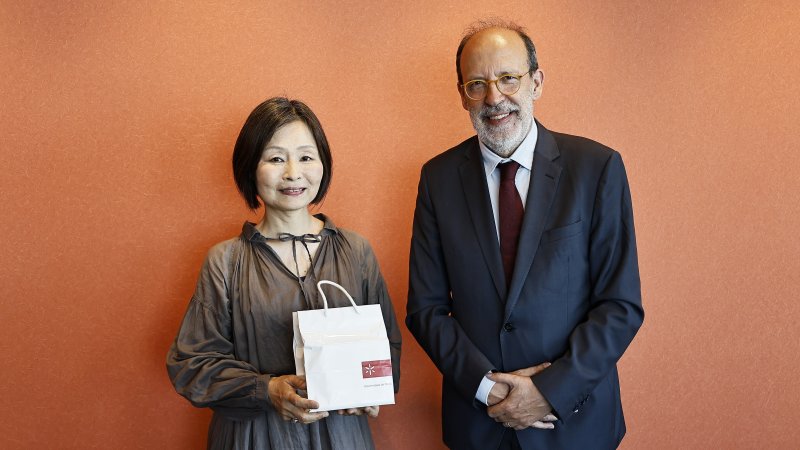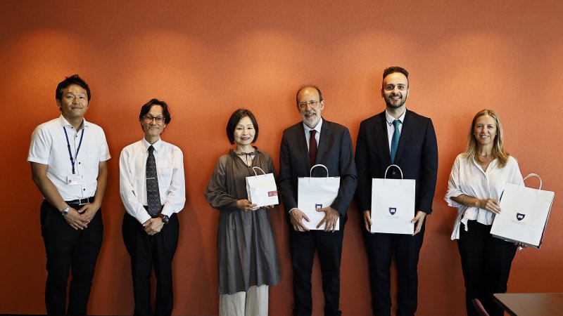 2025年7月22日(火)、ポルトガル・ミーニョ大学のルイ・ヴィエイラ・デ・カストロ(Rui Vieira de Castro)学長が本学を表敬訪問され、筒井佐代外国語学部長、清水政明外国学専攻長と意見交換をしました。ミーニョ大学からはジョアン・マルセロ・メスキータ・マルティンス(João Marcelo Mesquita Martins)アジア研究学科副長(東洋研究学士課程長)とアナ・パウラ・マルティンス(Ana Paula Martins)学長室長、本学からは鳥越慎太郎ポルトガル語専攻講師が同席しました。