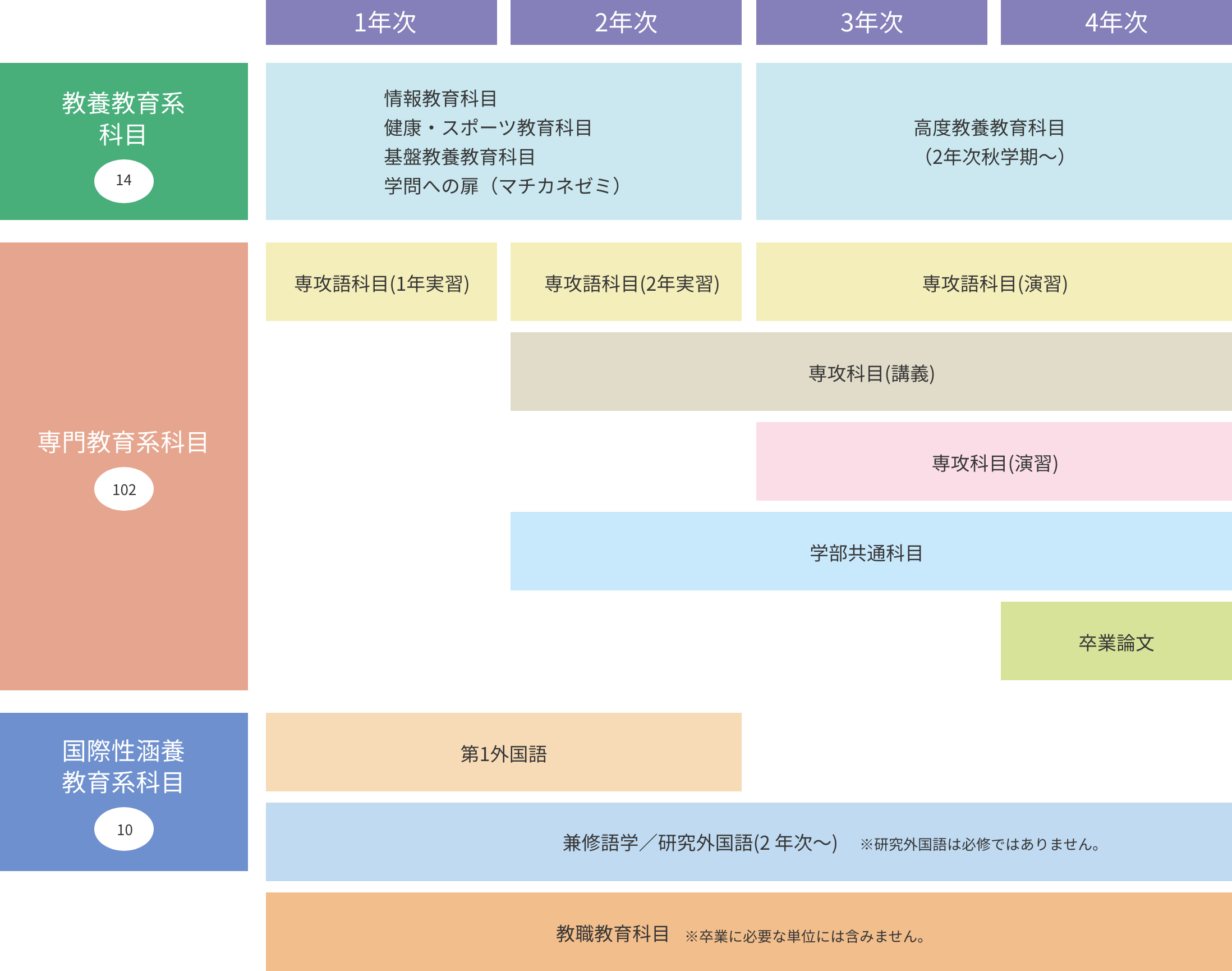 - 1年次・2年次には基礎的な言語運用能力および地域文化一般的知識を、3年次・4年次には高度な言語運用能力およびその言語圏文化の実情に応じた地域文化の専門的知識を習得します。